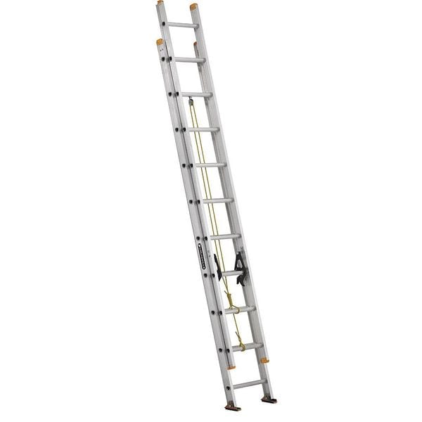 This 20-foot Louisville Ladder aluminum extension ladder has a 250 lbs. load capacity, rated ANSI I. This extension ladder is great for working on light construction and residential jobs. It features D shaped rungs that are fully serrated for a slip resistant surface. It has mar-resistant rail end caps to protect landing surfaces and provide longer life. Includes two extra heavy duty slide guides at the top of the base section combined with a stop on the fly section to prevent over extending the extension ladder. Features steel swivel safety shoes with metal shields specifically designed for extension ladders, ensures stability and safety even on uneven surfaces.
