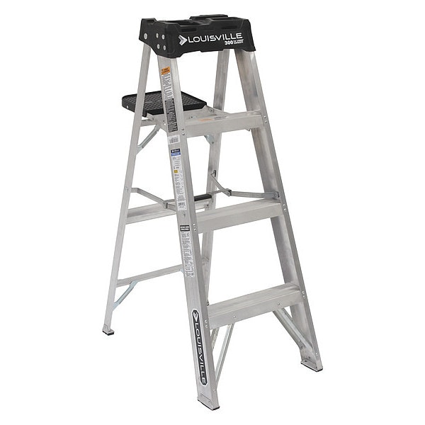 This Louisville Ladder 4-foot Aluminum Step Ladder combines lightweight portability and robust safety, making it an essential tool for various tasks. Despite its tough-as-nails construction, this ladder weighs only 11 pounds, ensuring easy transport and setup. Designed for durability, it boasts a 300-pound capacity with an elegant design and smooth finish, making it a reliable and sturdy choice for any job. For ultimate stability, it features slip-resistant rubber feet and aluminum angle feet with thick rubber tread on all four legs, ensuring secure footing on any surface. Tailored to meet your specific needs, this ladder incorporates a molded top with a recessed, non-conductive tray, offering convenient tool storage and enhanced functionality. Engineered to meet or exceed all safety standards set by ANSI and OSHA, this aluminum step ladder guarantees reliable performance in any situation.