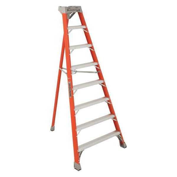 Tripod Stepladder, Material Fiberglass, ANSI Type IA, Ladder Height 8 ft, Load Capacity 300 lb, Number of Steps 7, Base Spread 56 in, Bottom Width 43 in, Step Depth 3 in, Step Tread Ribbed, Series FT1500, Includes Center-Pull Spreader Brace, Heavy Duty Reinforcements, Raptor Boot, Raptor Top, SHOX(TM), Standards ANSI, OSHA Compliant, Rung/Step Spacing 12 in