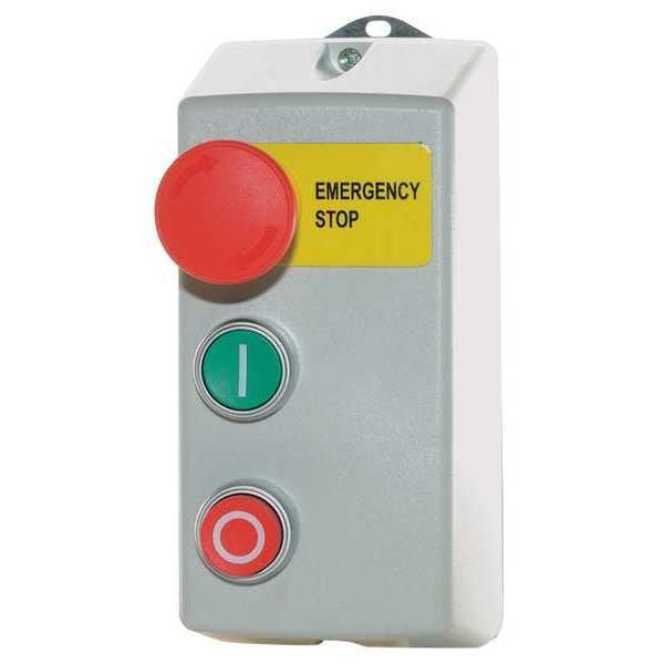 Control Station, Number of Operators 3, Number of Pilot Lights 0, Size 30 mm, Legend Emergency Stop, Type of Operator Flush Button/Flush Button, Action Maintained/Momentary/Momentary, Operator Color (2) Red, Green, Contact Form 4NO, Mechanical Interlock No, NEMA Rating 4X, Contact Rating 10A @ 600V AC, IP Rating IP65, Mounting Wall, Hub 1/2 in to 3/4 in NPT, Height 7.25 in, Width 3.5 in, Depth 6.5 in, Head Material Plastic, Enclosure Material Plastic, Enclosure Color Gray