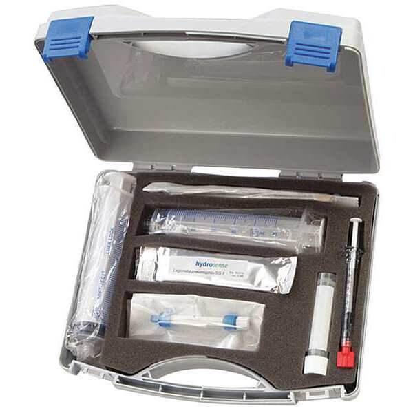 Legionella Risk Assessment Water Test Kit, Legionella Testing, Range 0 to 1 mg/L, Number of Tests 4, Includes Sample Collection Jar, (2) 50-60 ml Syringes, (2) Reaction Tubes, (2) Single-Use Filters, (2) Swabs, (4) Test Strips with Dispensing Pipettes, Instructions in Carrying Case, Recovery Buffer