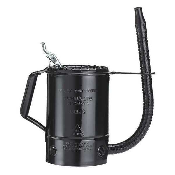 Measuring Container with Pour Spout, Material Steel, Fluid Capacity 64 fl oz, Overall Diameter 6 in, Overall Height 8 in, Spout Outside Diameter 1/2 in, Spout Length 14 in, Color Black, Flow Capacity 64 oz, Bowl Capacity 2 qt, Finish Painted, Includes Flex Spout, Mouth Shape Round, Spout Type Flexible