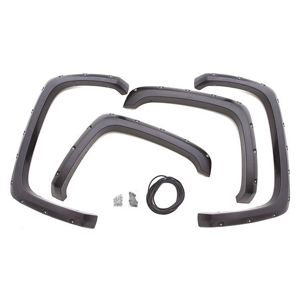 Fender Flares, Fender Type Rivet, ABS, Black, Finish Smooth, Width 3 in, Compatible with Make/Model/Year 2007 to 2014 Chevrolet Silverado 1500, 2500, 3500, Cutting Required No, Drilling Required No, Includes Mounting Hardware, Mounting Style Bolt-On, Net Weight 14 lb