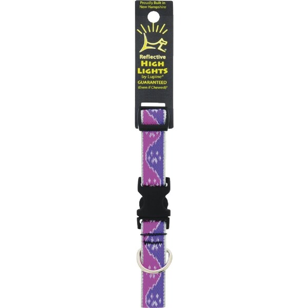 Lupine reflective dog collar has reflective threads woven directly into the design-Never printed so it will not rub or peel off. Collar is fully adjustable with custom designed YKK buckles. Strong durable soft woven nylon webbing and welded steel D-ring.