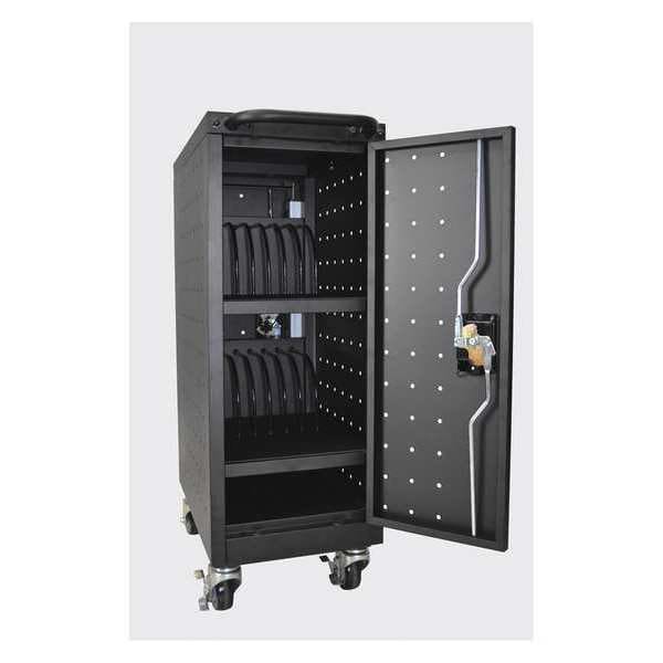 Conveniently store and charge up to 16 tablets or Chromebooks with Luxor’s vertical charging station. This sleek cart features a 16-outlet UL-Listed electrical power strip that keeps devices fully charged while rubber-coated dividers protect devices during transport. The mobile charging cart features all-steel construction with ventilation on all four sides, and includes four 3†non-skid, full swivel casters, two with locking brakes, that easily glide on any floor surface. Best of all, this steel cart requires minimal assembly; simply attach the casters and ergonomic push handle and be ready to go.
