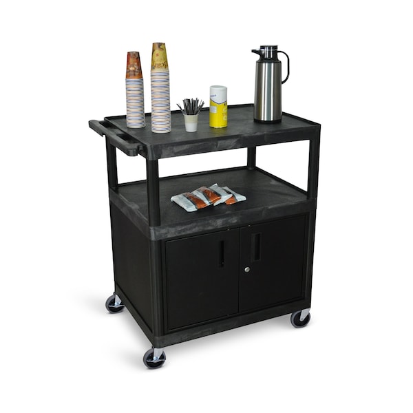 Multipurpose serving cart ideal for lightweight industrial, healthcare, food service or office applications. Shelves constructed of durable molded plastic that will not stain scratch dent or rust. Locking steel cabinet with full piano-hinge doors for storage. Ergonomic push handle for versatility and easy maneuverability. Rolling cart with 4" ball bearing casters two with locking brake for mobility and stability. Maximum weight capacity: 300 lbs (evenly distributed). Assembly required. Made in the USA