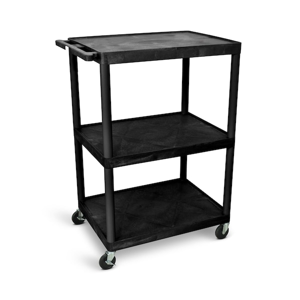 The Luxor 48"H AV Cart offers three large shelves with ample clearance for storing and transporting up to 400 lbs. of AV equipment and more. All three shelves offer a .25" retaining lip to secure items in place and are made of molded plastic that won't scratch, dent, rust or stain. This mobile cart also features a push handled molded into the top shelf and four 4" heavy-duty casters with two locking brakes for enhanced maneuverability and stability.
