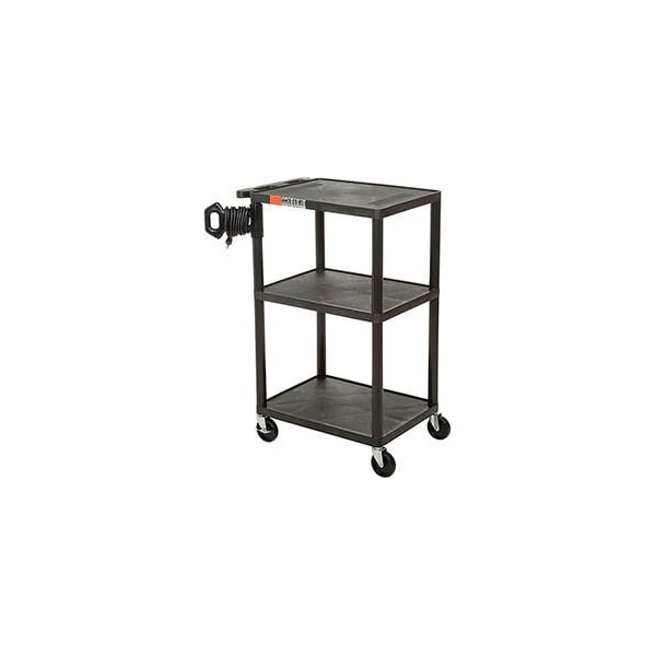 ENDURA PRESENATION STATION. OPEN 3 SHELF TABLE WITH ELECTRIC. SHELF SIZES 18"W X 24"D X 41"H. OVERALL. CLEARANCE BETWEEN TOP AND MIDDLE SHELF IS 14-1/4" AND MIDDLE AND BOTTOM IS 17-3/4"
