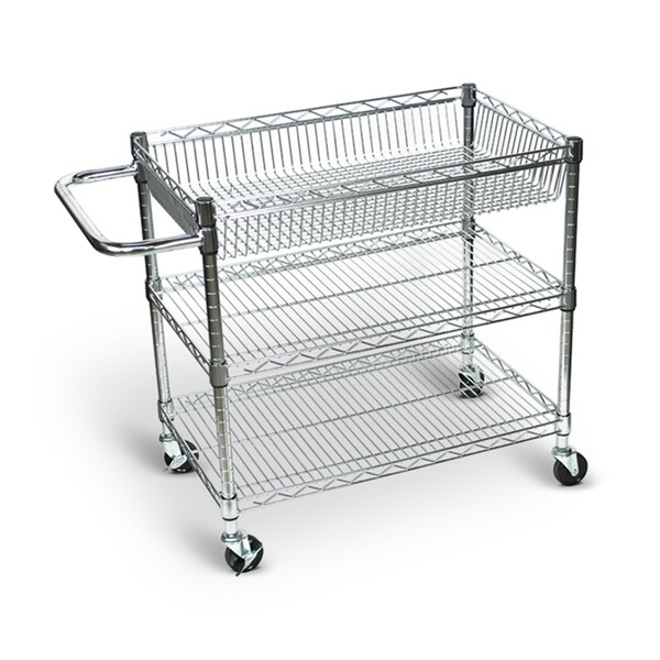 This heavy-duty rolling wire utility cart suits a variety of stowing or transporting needs. The top basket shelf is great for handling round or odd-shaped items; the bottom two shelves are adjustable to allow plenty of storage space. This cart is constructed of chrome-plated steel for long-lasting strength; 3" swivel casters (two lockable) and a sturdy handle enable easy rolling around a kitchen, down hallways or across a factory floor.