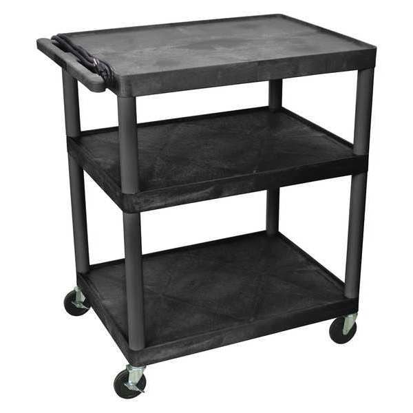 This Luxor AV Cart features three large shelves to provide ample space for holding and transporting up to 400 lbs. of audio/video equipment. The three shelves offer a .25" retaining lip to secure items in place and are constructed from molded plastic that won't scratch, dent, rust or stain. An ergonomic handle that's molded into the top shelf and four 4" full-swivel casters (two with locking brake) make the rolling cart easy to maneuver. Made in the USA