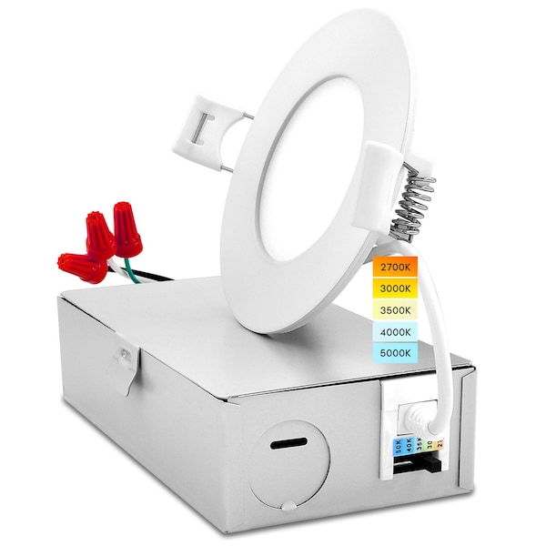 Luxrite Ultra Thin Recessed Lighting with 5 Color Temperature Switch The perfect solution to those that want the ability to pick the correct light for your home or business With these Luxrite LED recessed ceiling lights, you are offered 5 color temperature options to choose from with an easy to use switch attached to each down light Choose from 27K warm white, 3000K soft white, 3500K natural white, 4000K cool white, or 5000K bright white with just a simple adjustment Built with a lightweight and thin design, each LED wafer light is easy to handle and install into your shallow ceilings No can is needed since each ultra thin recessed light comes with it's own jbox for easy wiring and spring loaded clips for a flush to ceiling finish You'll be able to use these downlights indoors and outdoors since each fixture is wet location rated to handle rain and damp areas, so feel free to install in soffits, eaves, or even showers Control the light output with it's smooth dimming capabilities which can go from 100 to 10 light, giving you a comfortable space every time