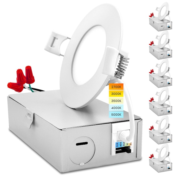 Luxrite Ultra Thin Recessed Lighting with 5 Color Temperature Switch The perfect solution to those that want the ability to pick the correct light for your home or business With these Luxrite LED recessed ceiling lights, you are offered 5 color temperature options to choose from with an easy to use switch attached to each down light Choose from 27K warm white, 3000K soft white, 3500K natural white, 4000K cool white, or 5000K bright white with just a simple adjustment Built with a lightweight and thin design, each LED wafer light is easy to handle and install into your shallow ceilings No can is needed since each ultra thin recessed light comes with it's own jbox for easy wiring and spring loaded clips for a flush to ceiling finish You'll be able to use these downlights indoors and outdoors since each fixture is wet location rated to handle rain and damp areas, so feel free to install in soffits, eaves, or even showers Control the light output with it's smooth dimming capabilities which can go from 100 to 10 light, giving you a comfortable space every time