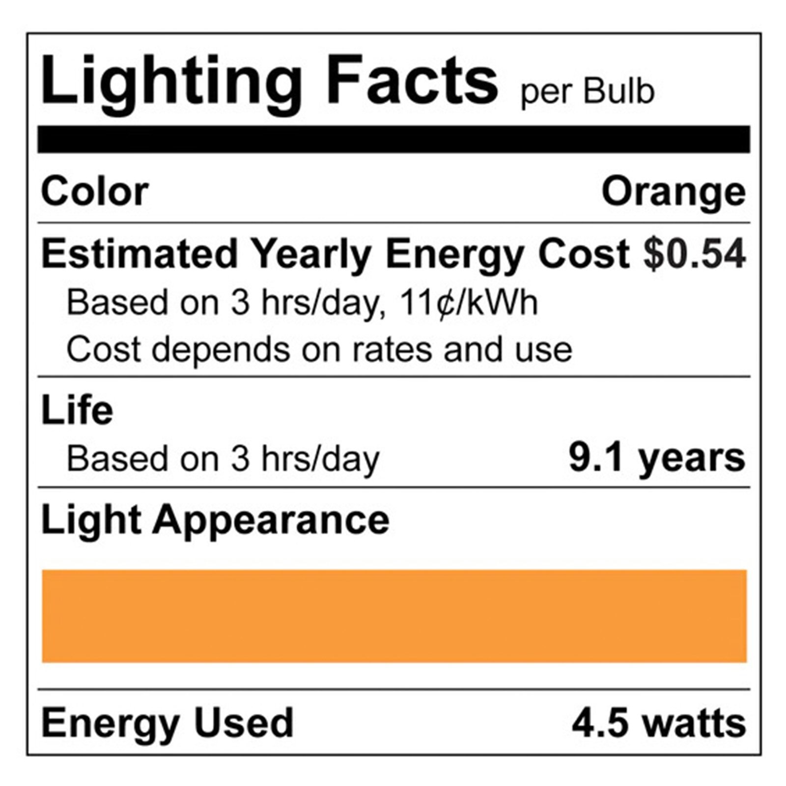 - •COLORFUL LIGHT - Each orange LED light bulb provides bright and vibrant colored light to any space of your home. Whether you want to use these indoors or outdoors, these lights are wet location rated to work in your preferred location. Bring color to your life with a orange bulb that will show your spirit during Halloween, events, or as accent lighting.