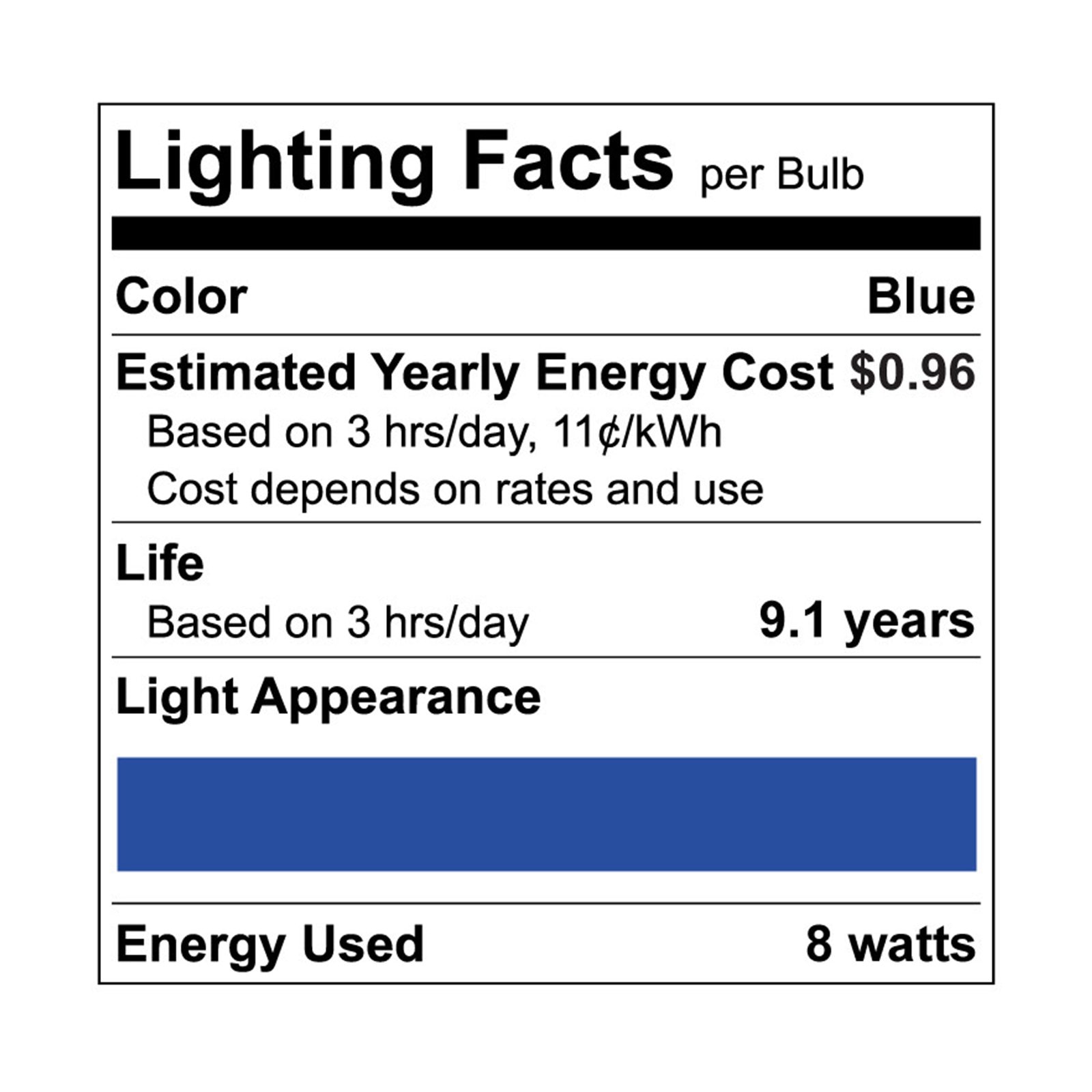 Luxrite A19 LED Colored Light Bulbs Express yourself with these colored LED bulbs that will brighten your space with vivid color that you will enjoy Available in a variety of colors, so you can mix and match other colored bulbs together for a unique twist to your space You can use these for general home lighting, holidays, events, special occasions, or make parties a blast with lights that will really bring out your spirit Each light bulb is equivalent to a 60 watt incandescent but only uses 8 watts of power, which means not only will you get to enjoy a colorful space but you will also save energy while doing it With it's damp location rating, you'll be able to use these in almost any location without issue Along with it's energy savings, these will also last 8 times longer than traditional lights with it's 10,000 hour lifetime Built to last, you can use these lights year after year and not have to think about getting replacements Zero flickering light, zero delay, and zero worry with Luxrite color light bulbs that are UL listed for your safety