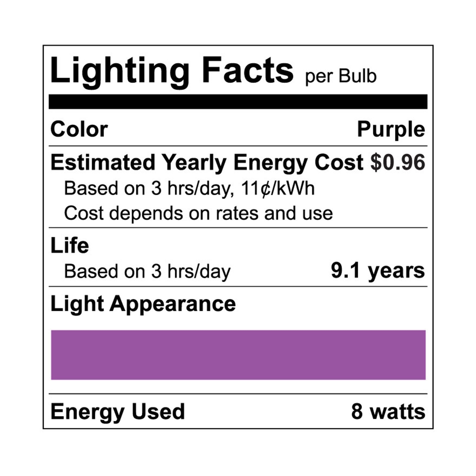 Luxrite A19 LED Colored Light Bulbs Express yourself with these colored LED bulbs that will brighten your space with vivid color that you will enjoy Available in a variety of colors, so you can mix and match other colored bulbs together for a unique twist to your space You can use these for general home lighting, holidays, events, special occasions, or make parties a blast with lights that will really bring out your spirit Each light bulb is equivalent to a 60 watt incandescent but only uses 8 watts of power, which means not only will you get to enjoy a colorful space but you will also save energy while doing it With it's damp location rating, you'll be able to use these in almost any location without issue Along with it's energy savings, these will also last 8 times longer than traditional lights with it's 10,000 hour lifetime Built to last, you can use these lights year after year and not have to think about getting replacements Zero flickering light, zero delay, and zero worry with Luxrite color light bulbs that are UL listed for your safety