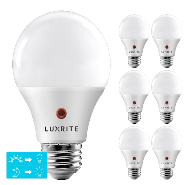 Luxrite Dusk to Dawn Light Bulbs Enjoy a convenient way to brighten the exterior of your home with dusk to dawn light bulbs which automatically turn on and off depending on the time of day Even when you are not home, these lights will turn on when it gets dark and illuminate the area No hands on action is necessary, allowing it to conserve energy when needed Not only will you save from the automatic sensing feature but they only use 9W of power comparable to a 60W incandescent bulb Featuring an E26 standard base, these can be used in any fixture including totally enclosed fixtures that still allow sunlight in These are a reliable choice for outdoor lighting and is safe to handle damp locations to provide continuous light Make the right choice for your future lighting in your porch, front yard, back yard, garage, hallways, driveways, and more