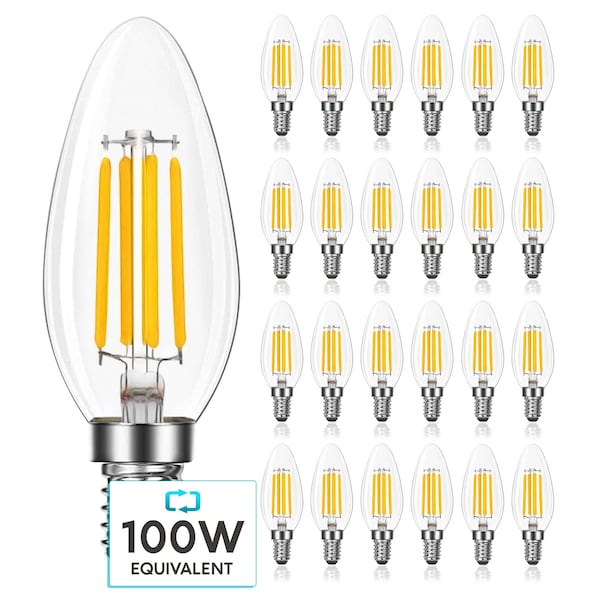 Luxrite Vintage LED Candelabra Light Bulbs Get the traditional appeal of old fashioned edison light bulbs without the high electricity usage Each LED filament bulb has a clear glass lens to allow for the highest efficiency of light usage, without loss of quality The exposed filament LED chips will not only save you energy but are eye catching in any space A solid construction with E12 candelabra base make these the ideal choice for decorative lighting fixtures such as chandeliers, ceiling fans, sconces, post lights, lanterns, and more Constructed to be equivalent to 100 watts which means you'll brighten your space and eliminate dark, shady areas which is not typically seen with chandelier bulbs Bright enough to let you see better but not harsh on the eyes Capable with lighting dimmers so you can control the amount of light you want in your home or office so you will always have the right amount of light for any situation With an astounding 10,000 hour lifetime, each candle bulb lasts 6 times longer than the traditional incandescent candle light bulb Feel secure knowing you won't have to replace these lights for the next 9 years Get continuous light with no interruptions and enjoy the classic edison style with LED technology Zero flickering, zero delay, zero worries
