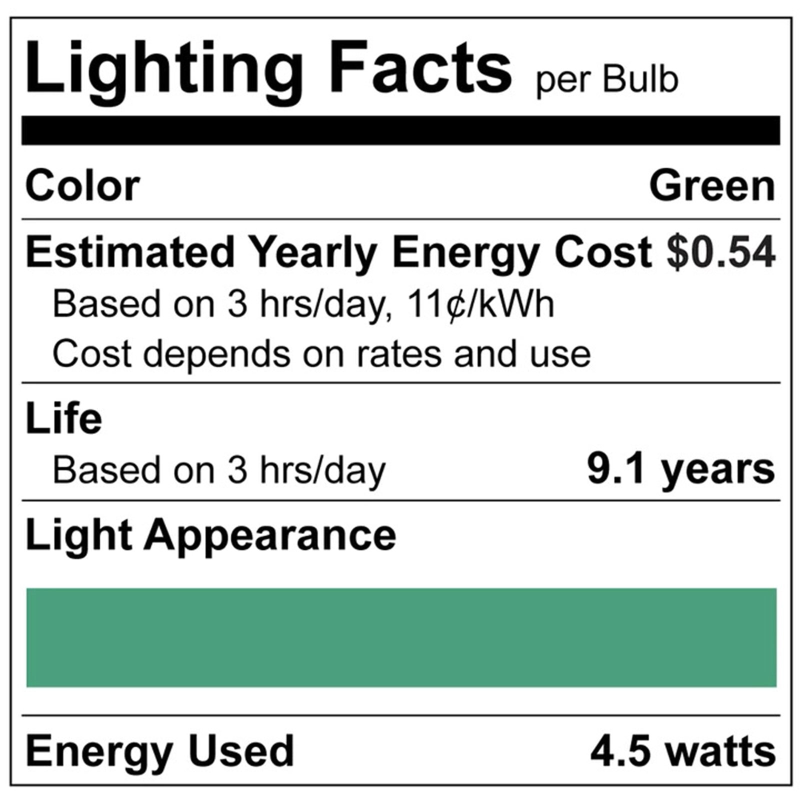 - •COLORFUL LIGHT - Each green LED light bulb provides bright and vibrant colored light to any space of your home. Whether you want to use these indoors or outdoors, these lights are wet location rated to work in your preferred location. Bring color to your life with green light bulbs that will show your spirit during Christmas, St. Patrick's Day, events and are ideal to use in your porch, sconce, post lamp, chandelier, ceiling fan, or as accent lighting.