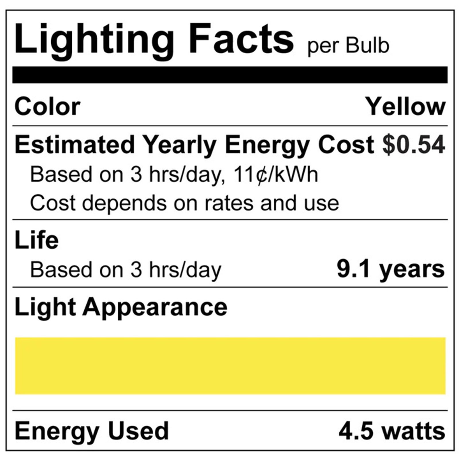 - •SAVE ENERGY - Cut the cost of your lighting with yellow light bulbs outdoor that is equivalent to 40 watt incandescents but only use 4.5 watts of power. During holidays, events, parties, or any special occasion, you'll be glad you moved to an energy efficient solution that will let you enjoy your lights more, without worry.