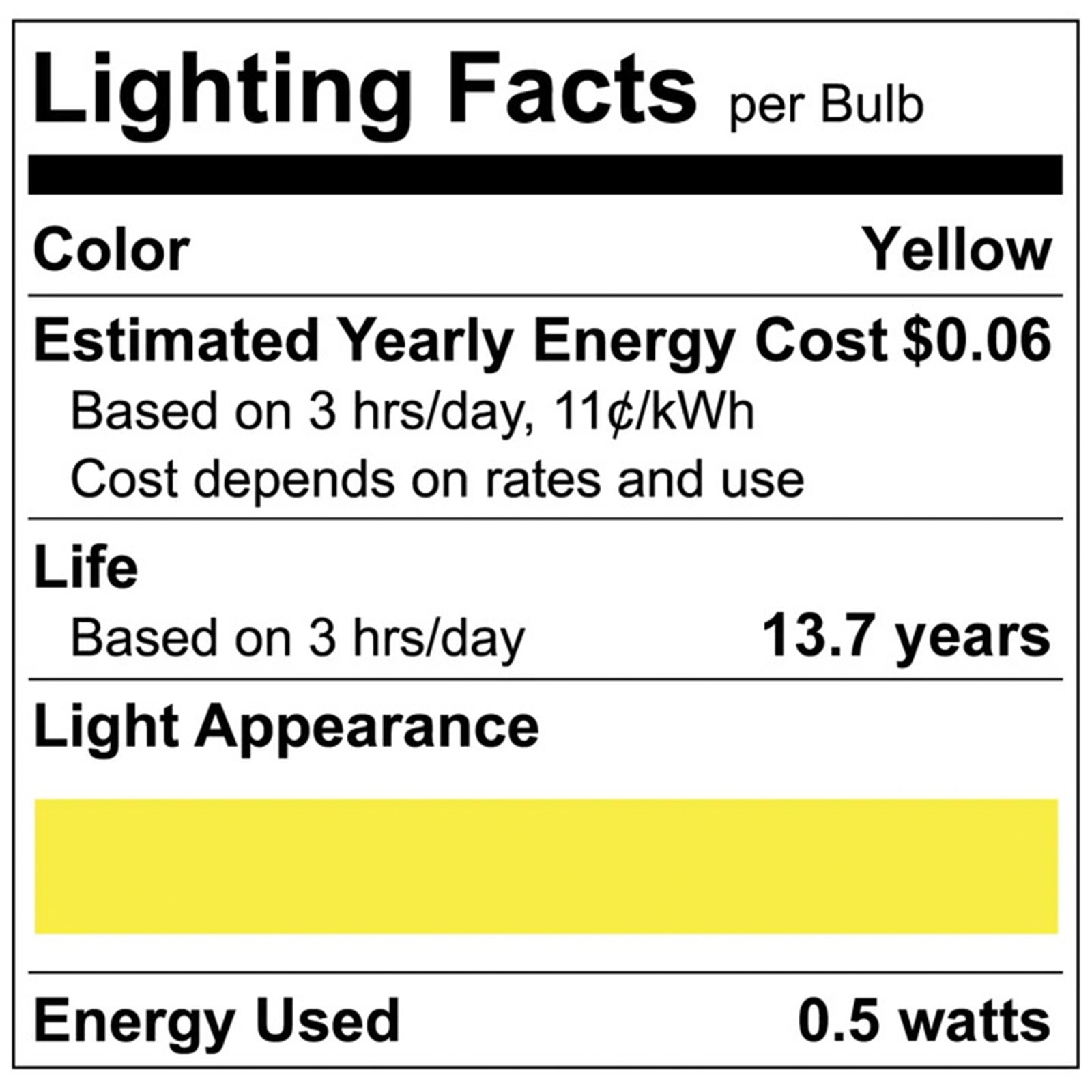 - •RELIABLE LIGHTING - Zero flickering light, zero delay, and zero worries when you use these yellow mini light bulbs in your indoor and outdoor space. These color bulbs for string lights are quick to install, have an E12 candelabra base, wet location rated and enclosed fixture rated for reliability, comes UL listed for your safety, and backed by a 2 YEAR WARRANTY.