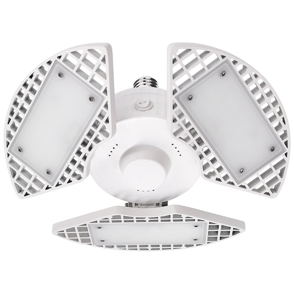 Luxrite 3Leaf LED Garage Light Brighten the look of your space with a garage light that offers ultra bright lighting in an adjustable design Each overhead garage light uses LED technology to produce 8000 lumens of powerful lighting in a 360 degree area in order to allow you to see more and eliminate dark areas With the deformable design, you can choose which direction you prefer your lighting for a truly customizable experience These are easy to install into E2627 standard home sockets, which means they require no tools and setup takes seconds With it's convenient onoff switch on the side, you can even install it in areas that have no connection to a wall switch Not only do they provide high quality light but they use less energy compared to standard garage and shop lighting Each fixture is built with a stury body and aluminum leaf panels to allow for heat dissipation during extended periods of use and improves overall operation Get the most out of your home lighting and switch to an energy efficient garage light that produces more light, has 90degree adjustable panels, is damp rated for reliability, has zero delay, zero flickering, and offers zero worries