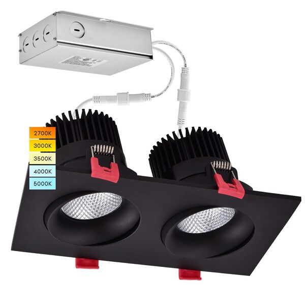 Luxrite Double Head Adjustable LED Recessed Lighting A complete retrofit lighting kit that works in any space requiring an allinone design, is quick and easy to install, and has 5 color options that you can switch between during installation to find the perfect color for your space Choose between 2700K warm white, 3000K soft white, 3500K natural white, 4000K cool white, and 5000K bright white for a truly customizable experience You can even adjust each light individually if you want to have 2 different colors at one time Each recessed ceiling light comes with a junction box with quick connectors for simple wiring and spring tabs for a flush to ceiling finish The adjustable center eyeball allows for a 15degree tilt and can rotate 360degree so you can light your home whichever way you need With the rectangle trim design, each fixture gives a sleek appearance and is perfect for modern spaces Whether you are doing a home remodel or working with a new construction, these ceiling lights allow for a quick change to energy efficient lighting Every gimbal LED downlight allows you to control the light output by being able to dim from 100 to 10 Set your light according to your mood and enjoy a pleasant atmosphere, every time Built with an astounding 50,000 hour lifetime so you won't have to think about replacing your light for the next 45 years, based on 3 hrsday usage Comes wet rated and energy star rated for reliability, IC and ETL rated for your safety, and has a 40degree beam angle for ideal accent lighting Get high quality home lighting with zero flickering, zero delay, and zero worries