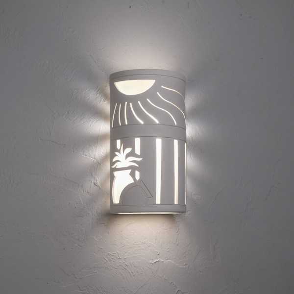 This backlit half-cylinder wall light with sun and plant cutouts will enhance your deck, porch or patio. Constructed of durable ceramic, it can withstand all types of weather conditions humid or dry, hot or cold. UL listed for wet locations, it's safe for illuminating outdoor areas, covered or exposed. The up/down light creates warm washes of light that accentuate your home's exterior surfaces and architectural details. There's no glaring light to disturb the neighbors. Luxury Lighting ceramic wall lights are available in a variety of sizes, styles and finishes so you'll be able to find the one you need!