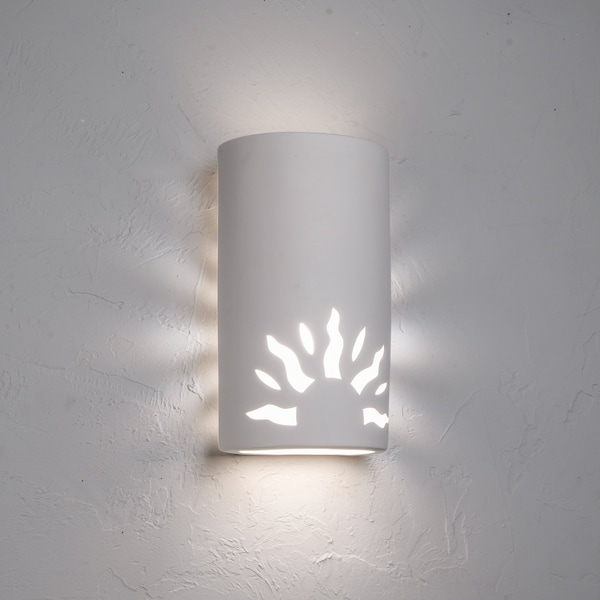 Luxury Lighting ceramic wall lights are available in a variety of sizes, styles and finishes so you'll be able to find the one you need. The half sun design of this backlit half cylinder wall light will add character to your deck, porch or patio. Constructed of durable ceramic, the fixture can withstand all types of weather conditions humid or dry, hot or cold. UL listed for wet locations, it's safe for illuminating outdoor areas, covered or exposed. The white bisque finish can be left as is or it can be latex-painted to blend with your home's exterior.