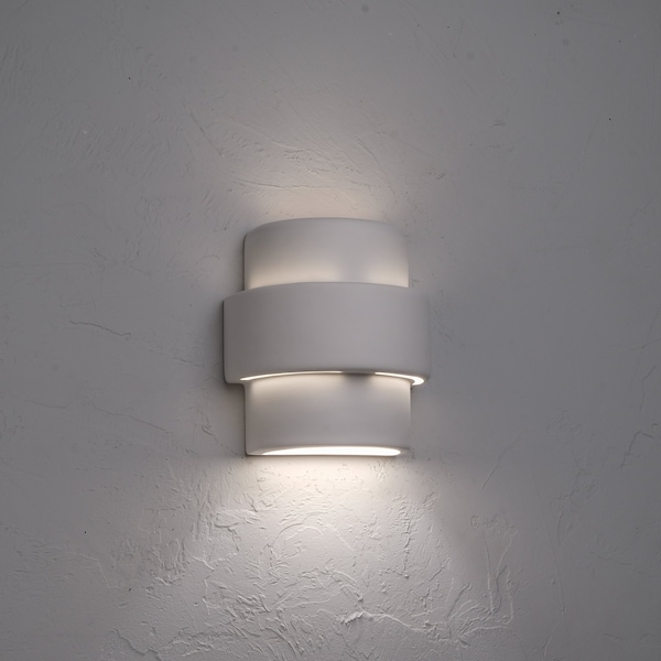 Luxury Lighting ceramic wall lights are non-corrosive and can withstand all types of climates humid or dry, hot or cold. Brighten your patio with this dimmable ceramic banded wall sconce. UL listed for wet locations, the beautiful half-cylinder fixture is safe for illuminating outdoor areas, covered or exposed. rust or corrode as metal does. The large central raised band allows light to flow in the open slits above and below. Install this lustrous light and enjoy the warm ambient glow in your outdoor seating area. The top and bottom are both open, allowing light to spread in all directions.