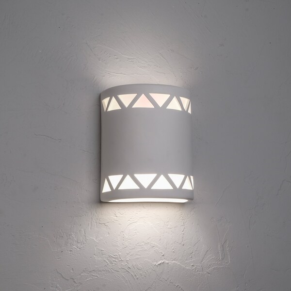 Luxury Lighting ceramic wall lights are durable and are suitable for all climates humid or dry, hot or cold. UL listed for wet locations, they're safe for illuminating outdoor areas, covered or exposed. Not only will these flush mount sconces brighten a dark entryway, deck, or patio, but they make your home safer and more attractive. This up/down light from the Jaken Collection features a pattern of triangles on a half-cylinder fixture. The white bisque finish can be latex-painted to blend with your home's exterior decor.