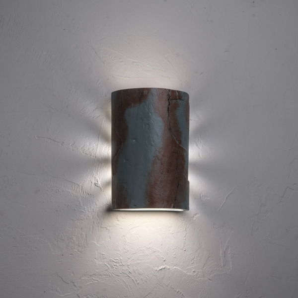 Luxury Lighting ceramic wall lights are non-corrosive and can withstand all types of weather humid or dry, hot or cold. A slate-like texture and grey color give this dimmable backlit half cylinder a Southwest look. UL listed for wet locations, it won't rust or corrode as metal does. The surface of this flush-mount fixture imitates the natural layers and cleavage of real slate. It's a beautiful addition to any home, especially those with wood siding or decorative areas of stone or rock.