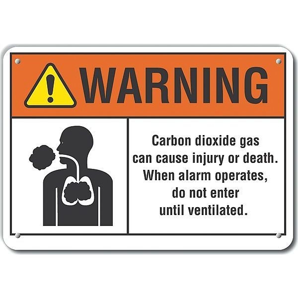 Aluminum Carbon Dioxide Warning Sign, Vertical Rectangle, Number of Printed Sides 1, English, Sign Format ANSI/OSHA Format, Sign Legend Carbon Dioxide Gas Can Cause Injury Or Death. When Alarm Operates, Do Not Enter Until Ventilated., Sign Legend Background Color White, Sign Legend Style Symbol and Text