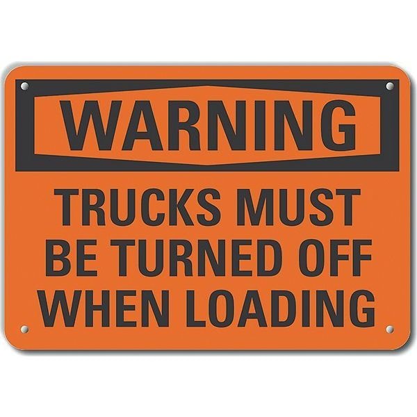 Aluminum Loading & Unloading Warning Sign, Vertical Rectangle, Number of Printed Sides 1, English, Sign Format Traditional OSHA, Sign Legend Trucks Must Be Turned Off When Loading, Sign Legend Background Color Orange, Sign Legend Style Text