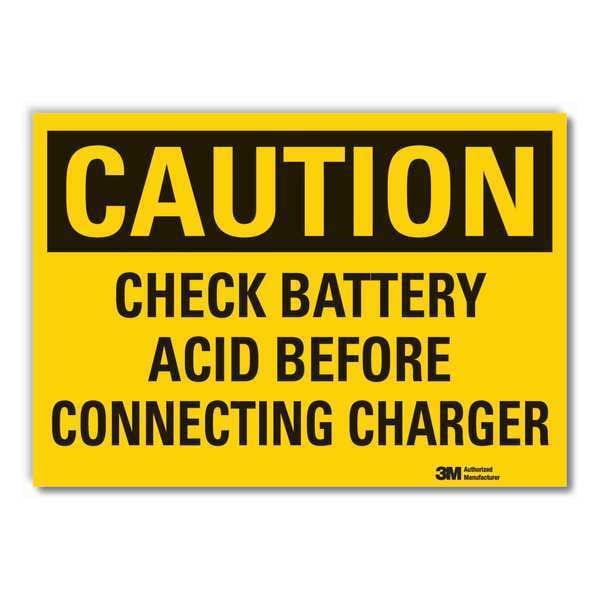 Battery Hazard Caution Reflective Label, Horizontal Rectangle, Number of Printed Sides 1, English, Sign Format Traditional OSHA, Sign Legend Check Battery Acid Before Connecting Charger, Sign Legend Background Color Yellow, Sign Legend Style Text