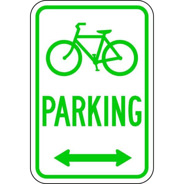 Bicycle Parking Double Arrow Parking Sign, Height 18 in, Width 12 in, Sign Material Aluminum, Sign Mounting Style Mounting Holes, Printed Language English, Sign Shape Vertical Rectangle