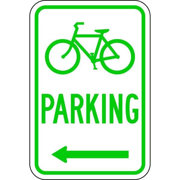 Bicycle Parking Left Arrow Parking Sign, Height 18 in, Width 12 in, Sign Material Aluminum, Sign Mounting Style Mounting Holes, Printed Language English, Sign Shape Vertical Rectangle