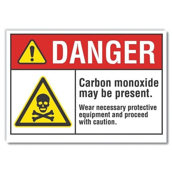 Carbon Monoxide Danger Label, Vertical Rectangle, Number of Printed Sides 1, English, Sign Format ANSI/OSHA Format, Sign Legend Carbon Monoxide May Be Present. Wear Necessary Protective Equipment And Proceed With Caution., Sign Legend Background Color White, Sign Legend Style Symbol and Text
