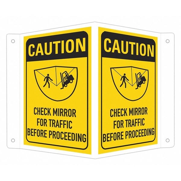 Facility Sign, V-Shape Projection, Number of Printed Sides 1, English, Sign Legend Check Mirror For Traffic Before Proceeding, Sign Legend Background Color Yellow, Sign Legend Style Symbol and Text