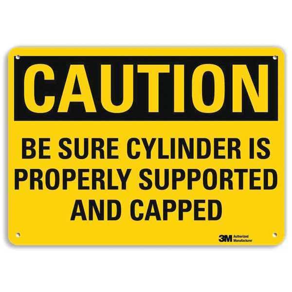 Caution Sign, Horizontal Rectangle, Number of Printed Sides 1, English, Sign Format Traditional OSHA, Sign Legend Be Sure Cylinder Is Properly Supported And Capped, Sign Legend Background Color Yellow, Sign Legend Style Text