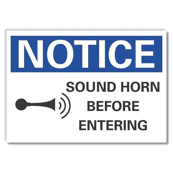 Caution Sign, Horizontal Rectangle, Number of Printed Sides 1, English, Sign Format ANSI/OSHA Format, Sign Legend Sound Horn Before Entering, Sign Legend Background Color White, Sign Legend Style Symbol and Text