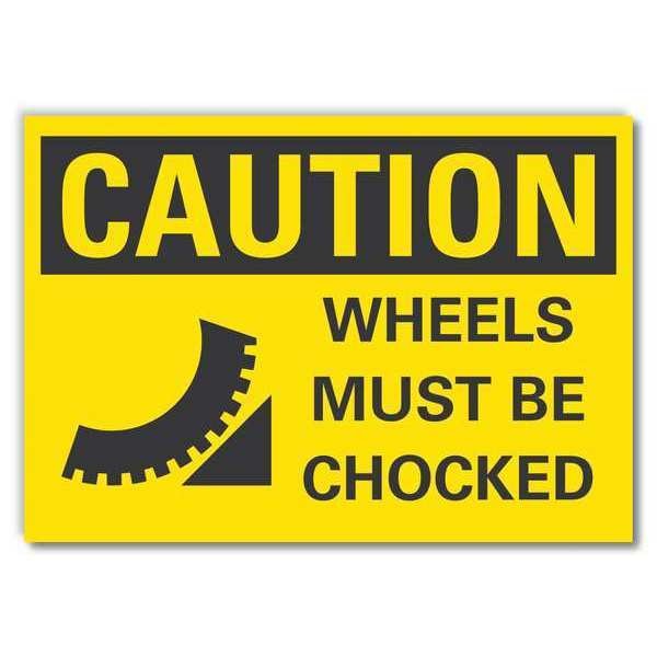 Caution Sign, Horizontal Rectangle, Number of Printed Sides 1, English, Sign Format ANSI/OSHA Format, Sign Legend Wheels Must Be Chocked, Sign Legend Background Color Yellow, Sign Legend Style Symbol and Text