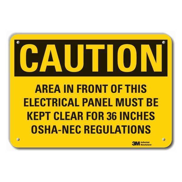 Reflective Electrical Panel Caution Sign, Horizontal Rectangle, Number of Printed Sides 1, English, Sign Format Traditional OSHA, Sign Legend Area In Front Of This Electrical Panel Must Be Kept Clear For 36 Inches Osha-Nec Regulation, Sign Legend Background Color Yellow, Sign Legend Style Text