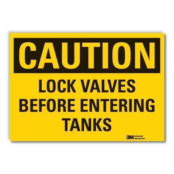 Caution Sign, Horizontal Rectangle, Number of Printed Sides 1, English, Sign Format Traditional OSHA, Sign Legend Lock Valves Before Entering Tanks, Sign Legend Background Color Yellow, Sign Legend Style Text