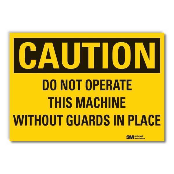 Caution Sign, Horizontal Rectangle, Number of Printed Sides 1, English, Sign Format Traditional OSHA, Sign Legend Do Not Operate This Machine Without Guards In Place, Sign Legend Background Color Yellow, Sign Legend Style Text