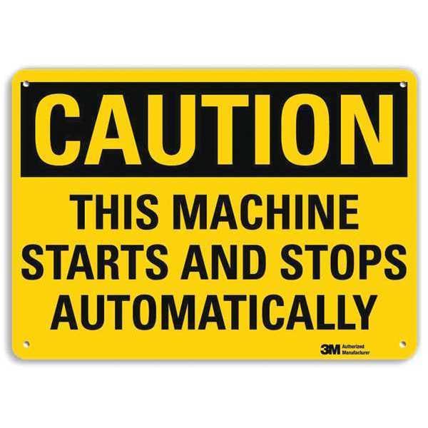Caution Sign, Horizontal Rectangle, Number of Printed Sides 1, English, Sign Format Traditional OSHA, Sign Legend This Machine Starts And Stops Automatically, Sign Legend Background Color Yellow, Sign Legend Style Text