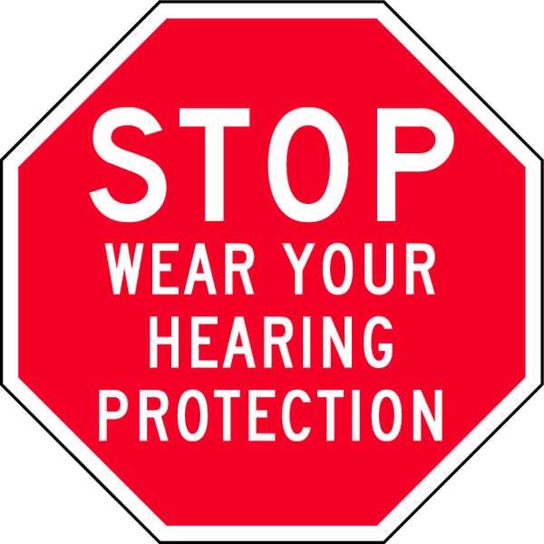 Safety Sign, Octagon, Number of Printed Sides 1, English, Sign Format Other Format, Sign Legend Stop Wear Your Hearing Protection, Sign Legend Background Color White, Sign Legend Style Text