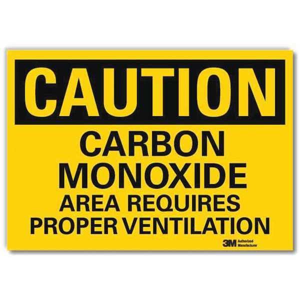 Caution Sign, Horizontal Rectangle, Number of Printed Sides 1, English, Sign Format Traditional OSHA, Sign Legend Carbon Monoxide Area Requires Proper Ventilation, Sign Legend Background Color Yellow, Sign Legend Style Text