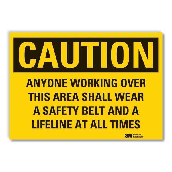 Safety Belts Caution Reflective Label, Horizontal Rectangle, Number of Printed Sides 1, English, Sign Format Traditional OSHA, Sign Legend Anyone Working Over This Area Shall Wear A Safety Belt And A Lifeline At All Times, Sign Legend Background Color Yellow, Sign Legend Style Text