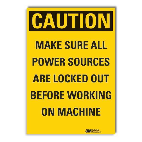 Lockout Tagout Caution Reflective Label, Horizontal Rectangle, Number of Printed Sides 1, English, Sign Format Traditional OSHA, Sign Legend Make Sure All Power Sources Are Locked Out Before Working On Machine, Sign Legend Background Color Yellow, Sign Legend Style Text