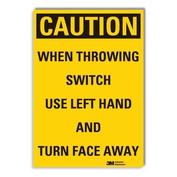 Machine & Operation Caution Reflective Label, Vertical Rectangle, Number of Printed Sides 1, English, Sign Format Traditional OSHA, Sign Legend When Throwing Switch Use Left Hand And Turn Face Away, Sign Legend Background Color Yellow, Sign Legend Style Text